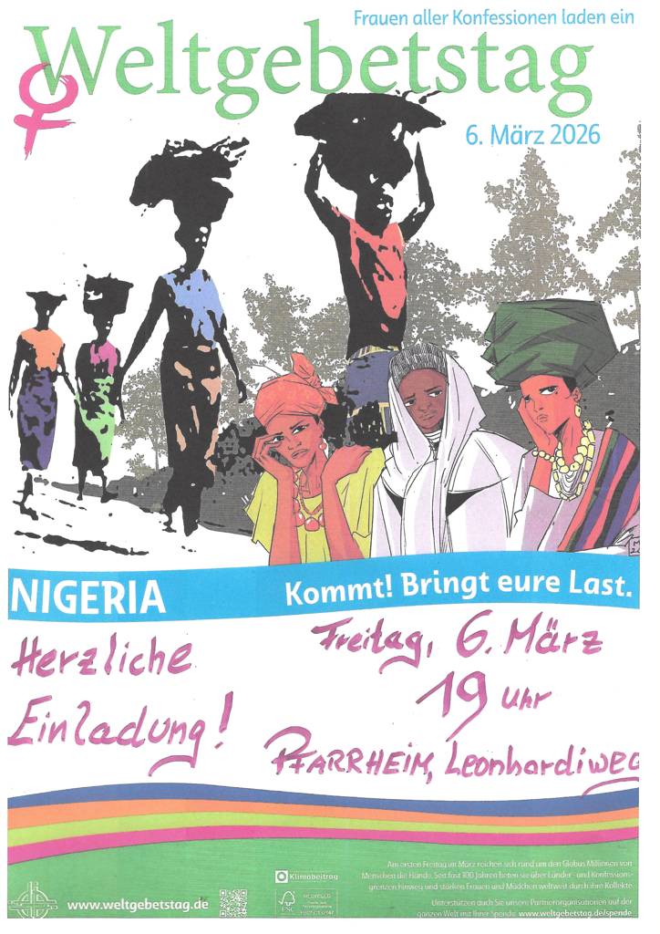 Herzliche Einladung zur Weltgebetstag der Frauen am 6. März um 19 Uhr im Pfarrheim. Wir bieten wieder zwei Probentermine für die Lieder an: Samstag, 28. Februar um 17 Uhr und am Donnerstag, 5. März um 18.45 Uhr, ebenfalls im Pfarrheim. Es wäre schön, wenn noch Interessierte aus eurem/Ihrem Bekanntenkreis mitkommen könnten!