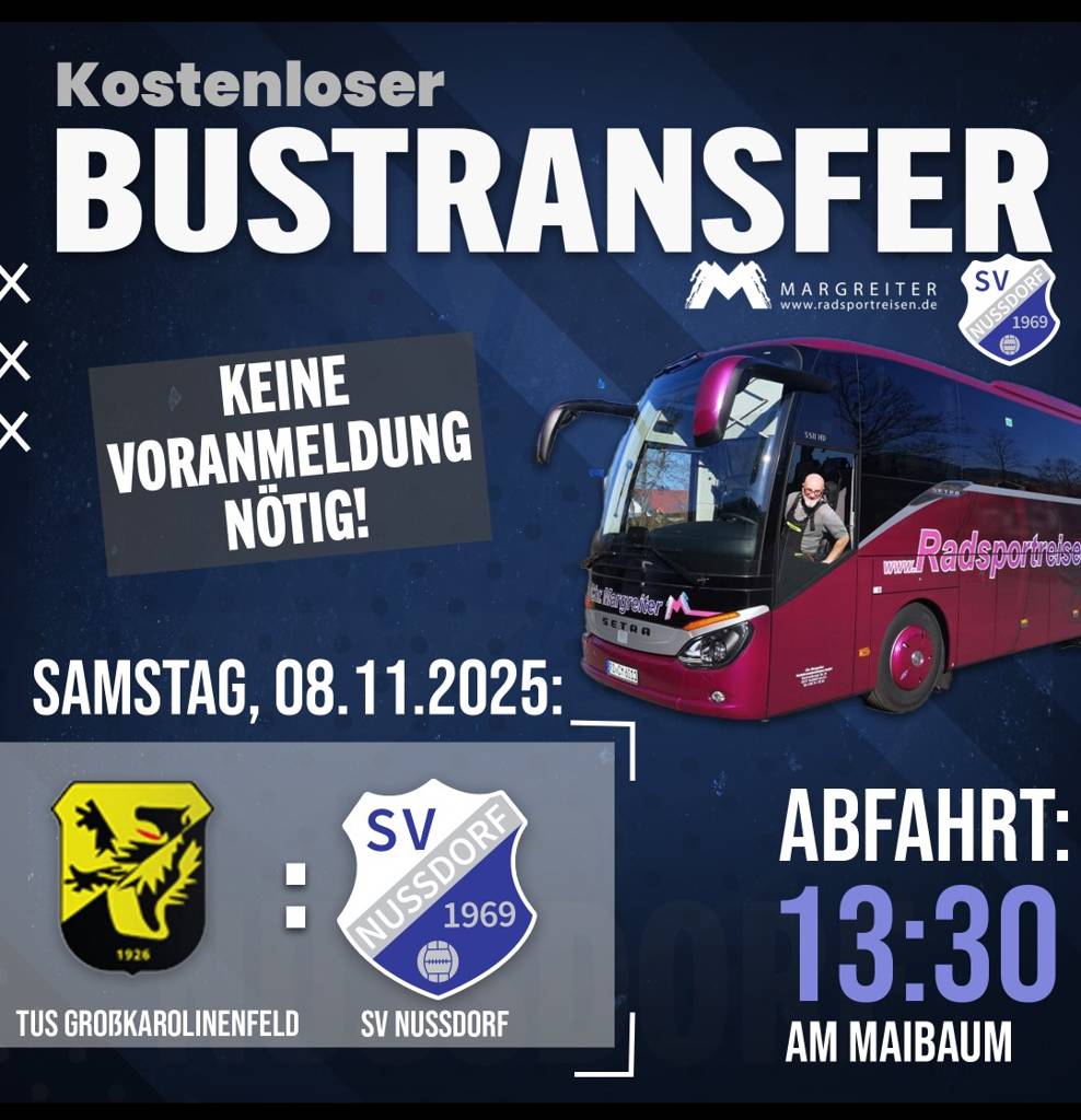Der SV Nußdorf lädt zur Auswärtsbusfahrt am 08.11.2025 unserer 1. Mannschaft gegen den TuS aus Großkarolinenfeld ein. Neben der kostenlosen Busfahrt, gibt es in Großkarolinenfeld eine Verlosung von Karten des FC Bayern gegen den FC St. Pauli.